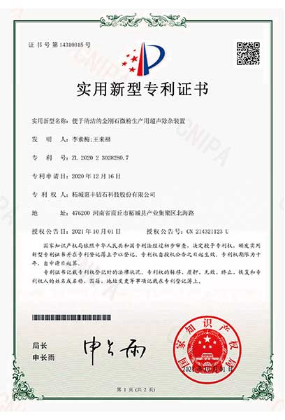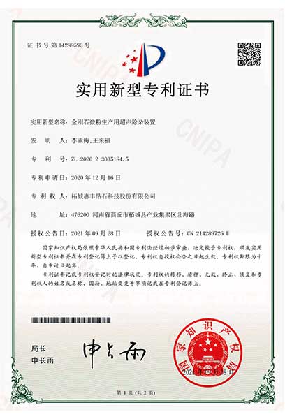 金剛石微粉生產(chǎn)用超聲除雜裝置 | ZL 2020 2 3035184.5 | 2021-09-28 |